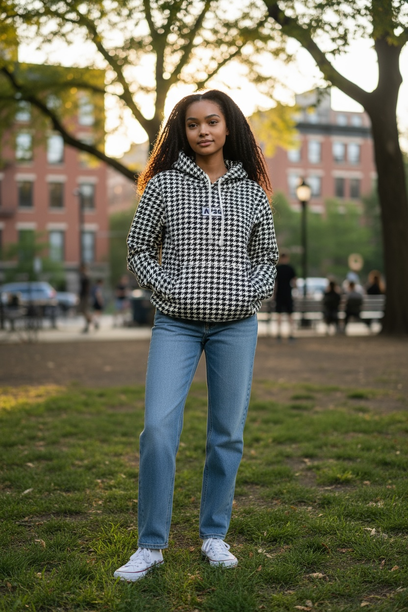 Bold pattern. Timeless message. This unisex hoodie blends classic houndstooth style with a powerful purpose. Featuring our signature AP2G logo embroidered in black and white on the chest, it’s a standout piece for those who praise with confidence. Crafted from a soft 70/30 cotton-poly blend, it offers comfort, durability, and elevated streetwear energy.